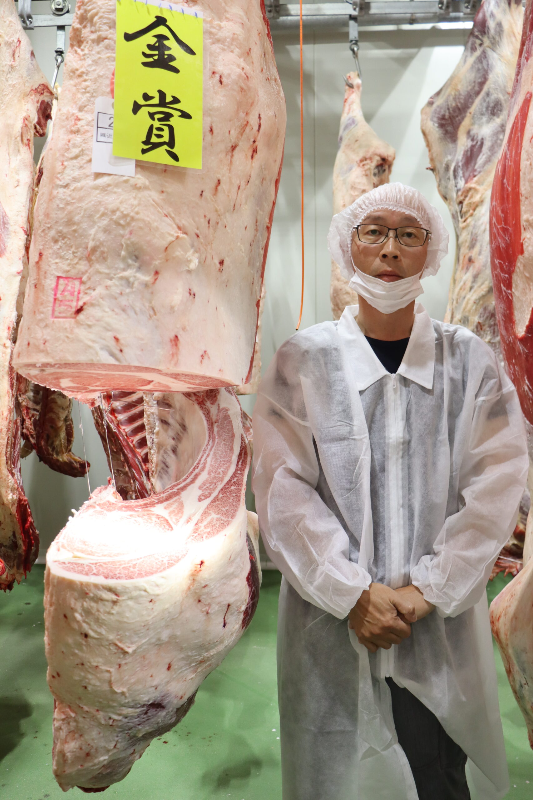 当日は、30頭が出品され、佐世保市知見寺町の㈱近藤畜産が最優秀賞を受賞しました。30ヶ月齢の去勢牛で枝肉重量は520.9キロ。父は「勝乃幸」、母の父は「平茂晴」、祖母の父は「安福久」。ロース芯面積100㎠、肉質等級はA5で、霜降りの度合いを示すBMSナンバーは12。また、枝肉はロース芯面積に迫力があり、枝肉の張りもよく、小ザシで無駄な脂肪がなく最優秀賞に相応しいものでした。セリでは出品牛が次々と高値で取引され、㈱近藤畜産さんの枝肉は3,502円(1キロ)で落札されました。