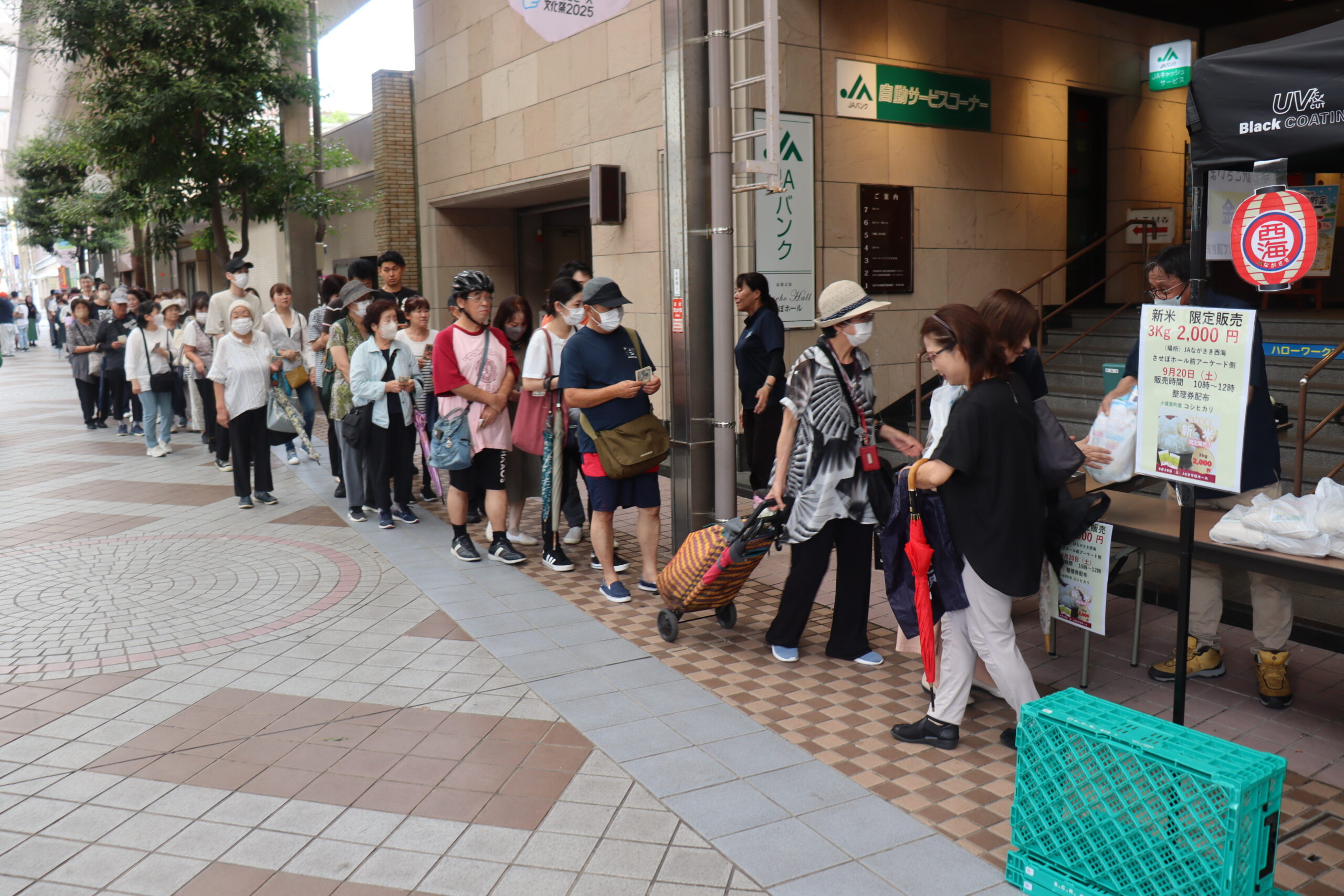 この日は、「地元の美味しいお米」を1袋2,000円で、計500袋用意。午前10時からの販売に整理券を求め大勢の市民が列をつくり、販売を開始した。アーケードを行き交う多くの市民が立ち寄り、安全・安心な米を手に取る機会となった。会場ではJA職員が積極的に声掛けを行い、若年層から高齢者まで幅広い世代が買い求める様子が見られました。販売は好調でした。同日、世知原茶の販売も合わせて行いました。