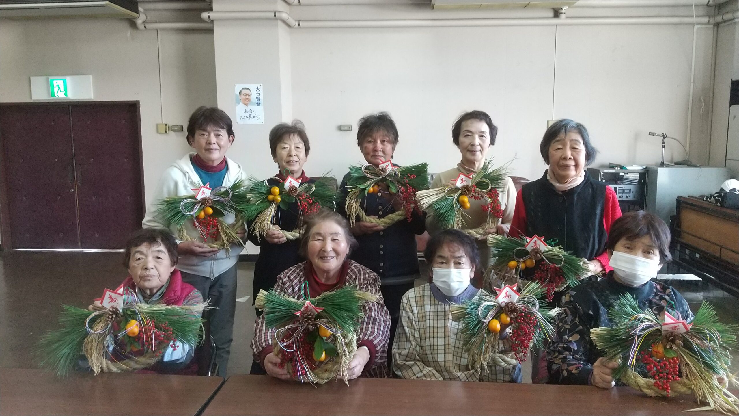 会員らは出来上がったしめ飾りを見せ合い、「来年はミニデイサービスを一回でも多く開催し参加された方の笑顔を見たい。元気に活動できるよう願いながら飾ります」と話しました。