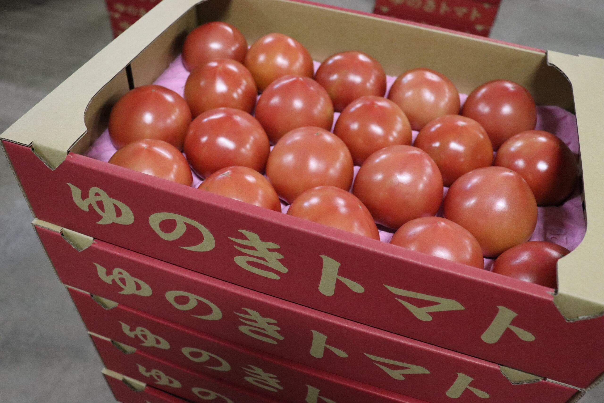 同地区は県内でも数少ない秋冬抑制トマトの産地で、高温期の定植でも安定した品質を保つ品種の「桃太郎グランデ」と「桃太郎75」をメインに栽培しています。柚木地区は標高250メートル以上に位置し収穫開始頃には朝夕の寒暖差が大きくなり、トマトの養分転流に適した気候で、味の濃い美味しいトマトが栽培できます。ゆのきトマトは管内のスーパーや直売所でも販売されすぐに売り切れるほど人気があります。
