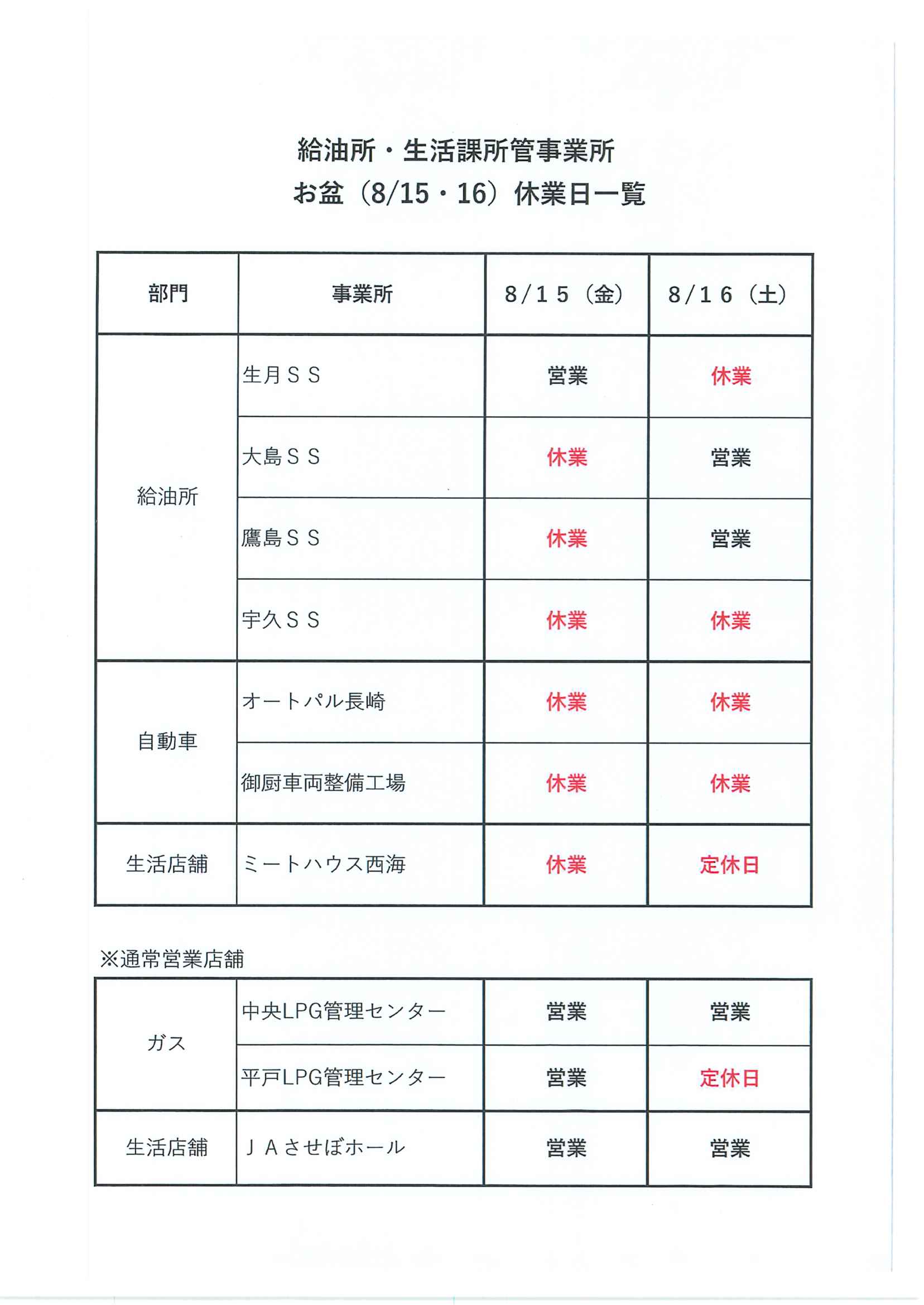 【給油所・自動車事業所・ミートハウス西海】お盆休業のお知らせ