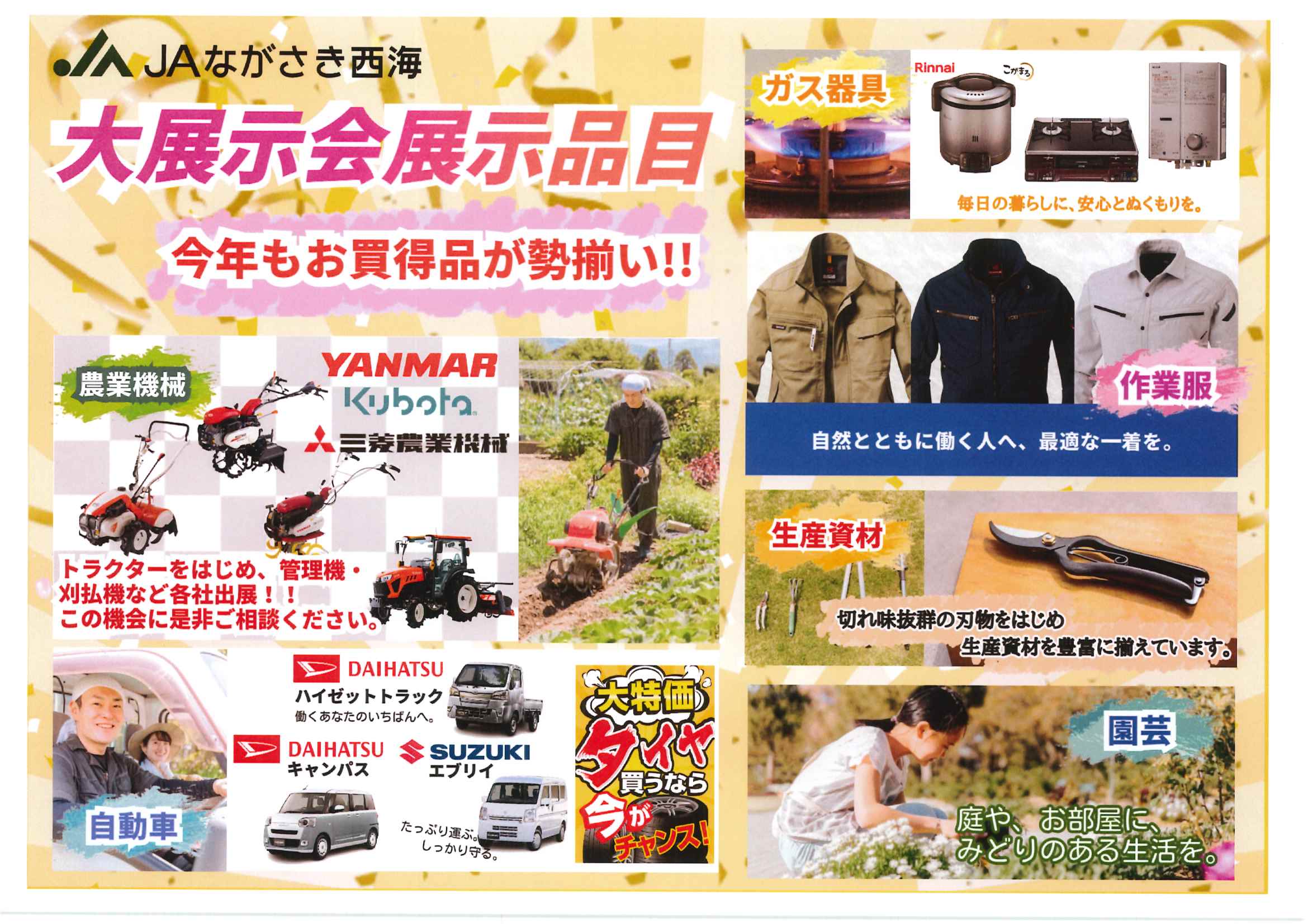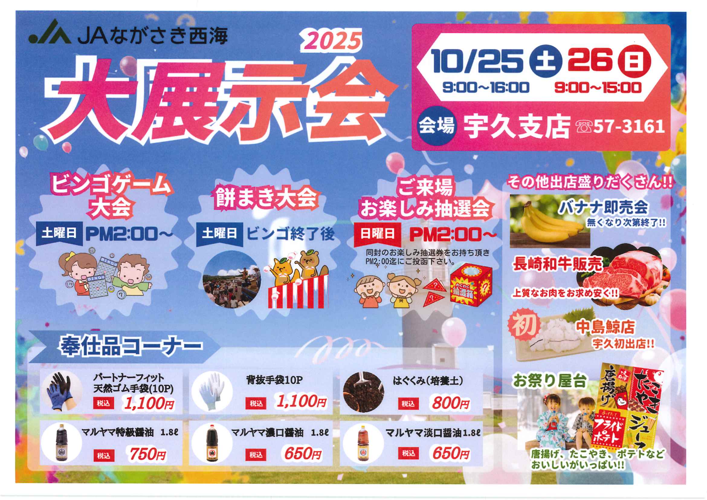 10月25日(土)と26日(日)にJA宇久支店にて大展示会2025を開催致します。農業機械や資材、長崎和牛肉の販売、屋台の出店など!両日ともに楽しいイベントがあります。ご家族そろってご来場ください。