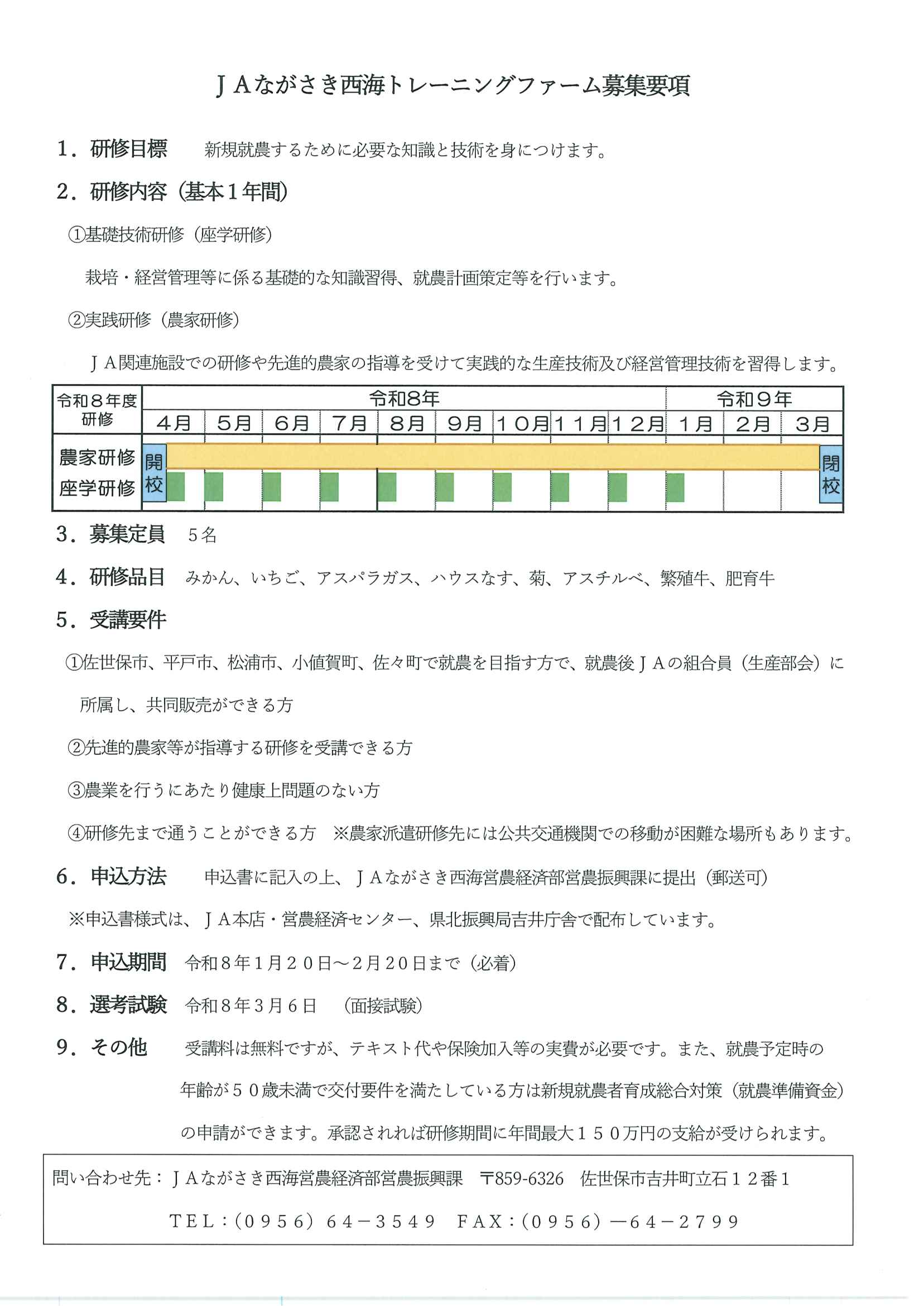 JAながさき西海では、令和8年4月開講の新規就農者研修『トレーニングファーム』の研修生募集を行います。