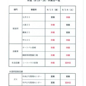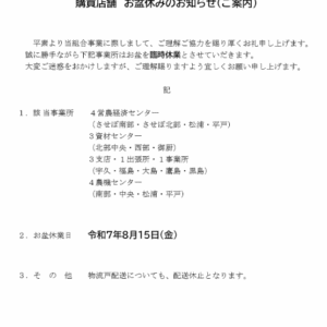 2025年08月05日(火) / 最終更新日時 : 2025年08月07日(木) jasaikai お知らせ 【給油所・自動車事業所・ミートハウス西海】お盆休業のお知らせ 標記の件について、下記の通りお盆休業とさせていただきます。組合員・利用者の皆様にはご不便・ご迷惑をおかけいたし […]