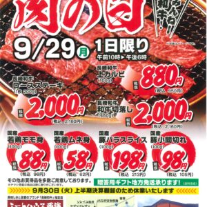 2025年09月25日(木) / 最終更新日時 : 2025年09月25日(木) jasaikai お知らせ 【ミートハウス西海】9/29肉の日セール開催のお知らせ 9月29日(月)は毎月恒例の肉の日特売セールを開催致します‼たくさんのご来店お待ちしております。 また今月30 […]