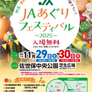 2025年10月01日(水) / 最終更新日時 : 2025年10月01日(水) jasaikai お知らせ 「JAあぐりフェスティバル2025」開催について 今年も「JAあぐりフェスティバル2025」を開催します! 地元で育った野菜・米・果物・長崎和牛・花などを大特価 […]
