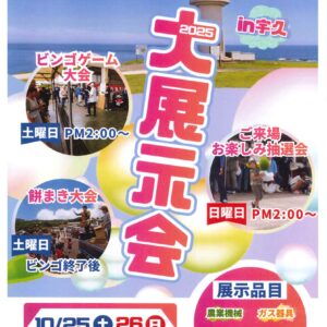 2025年10月10日(金) / 最終更新日時 : 2025年10月10日(金) jasaikai お知らせ 10/25・26大展示会2025(宇久)開催について 10月25日(土)と26日(日)にJA宇久支店にて大展示会2025を開催致します。農業機械や資材、長崎和牛肉の […]